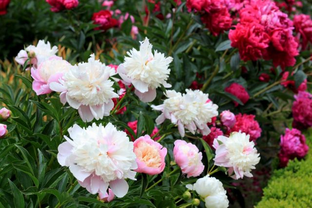 На моем участке 9 лет каждую весну цветут две роскошные клумбы, где царствуют пионы. Делать смешанные цветники я не стала, полностью отдав кусочек сада этим цветам. Белые источают тонкий устойчивый запах. Он успокаивает, поднимает настроение, поэтому там у меня устроен уголок отдыха. Напротив него растет несколько кустов с алыми цветами. Они не пахнут, но выглядят по-царски.
