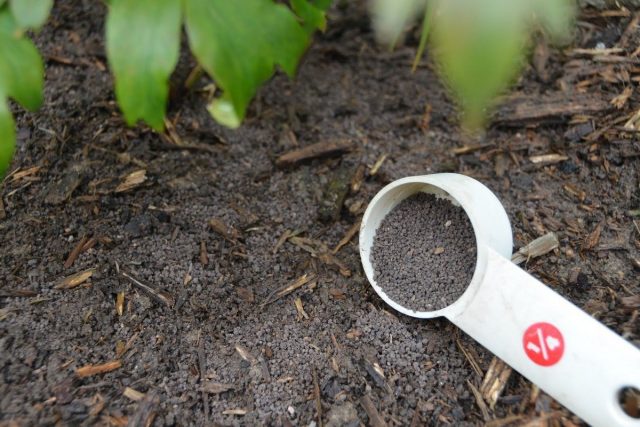 Гранулы минеральных удобрений в сухом виде просто рассыпаются по прикорневой зоне. © Southern Peony