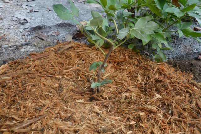 - Окучиваю кусты, стараясь не повредить уснувшие почки.