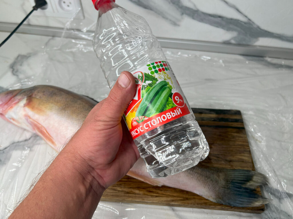 Надеваем перчатки и сначала вытираем рыбу, чтобы она была сухой — это очень важно. Сначала промываем, а потом тщательно насухо вытираем. Далее наливаем в руку уксус, и натираем рыбу, без фанатизма, протерли и оставили на 15-20 минут.