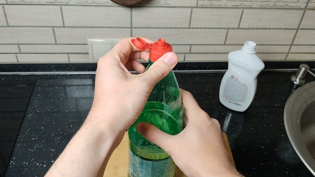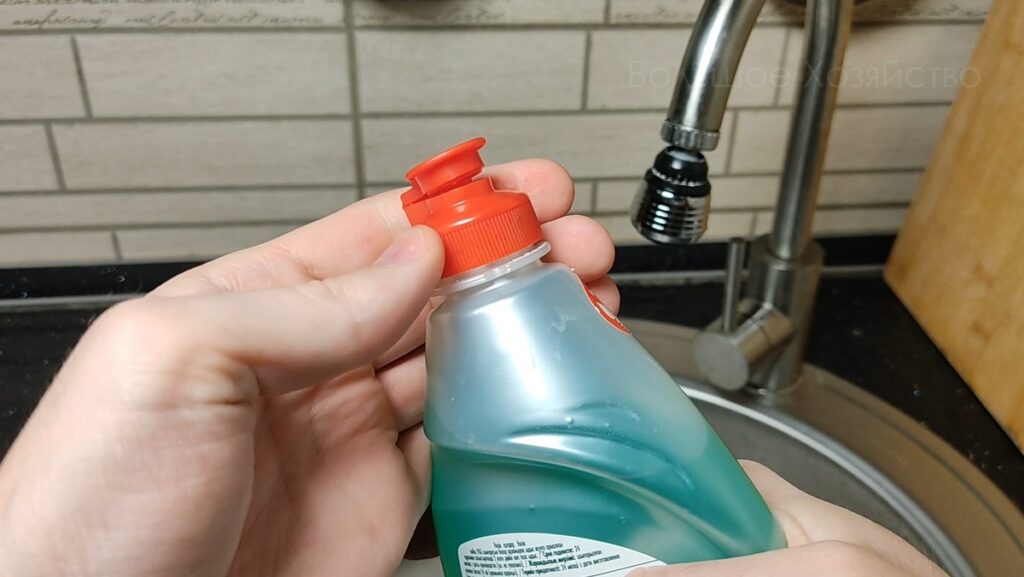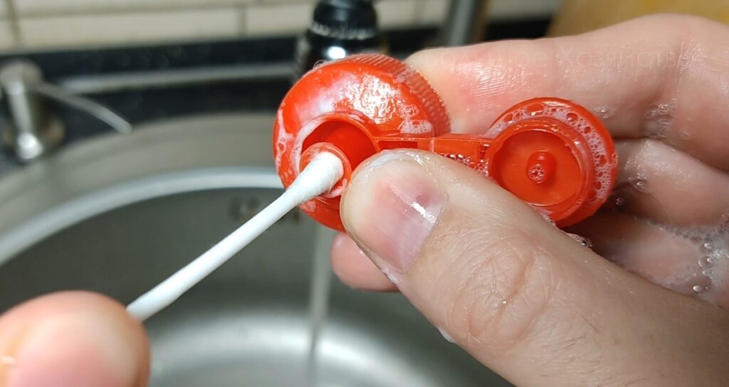 Просто открутил крышку от бутылки и хорошенечко её промыл под струёй воды. Для успокоения души можно использовать мыло, ватные палочки или щётки, чтобы убрать последние частички средства, но это не так важно. Почему?