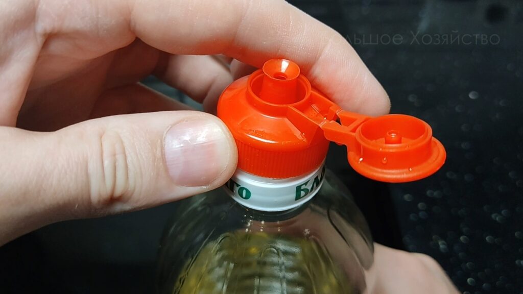После того, как убедился, что крышечка идеально чистая, я достал из шкафа бутылку подсолнечного масла. И просто заменил крышку в бутылке.