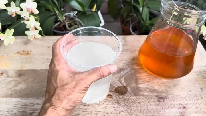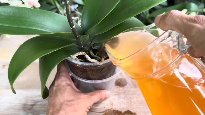 Этим корично-рисовым настоем обильно пролейте орхидею так, чтобы влага вытекла (предварительно поставьте её в ёмкость побольше). Оставьте в таком виде на полчаса.
