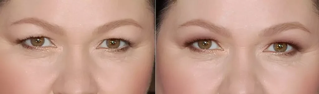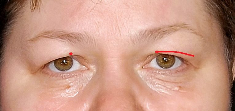 Обратите внимание, на фото ниже неподвижное верхнее веко несколько отечное, оно бросается в глаза, так как намного светлее, чем прокрашенный глаз — оно объемное.