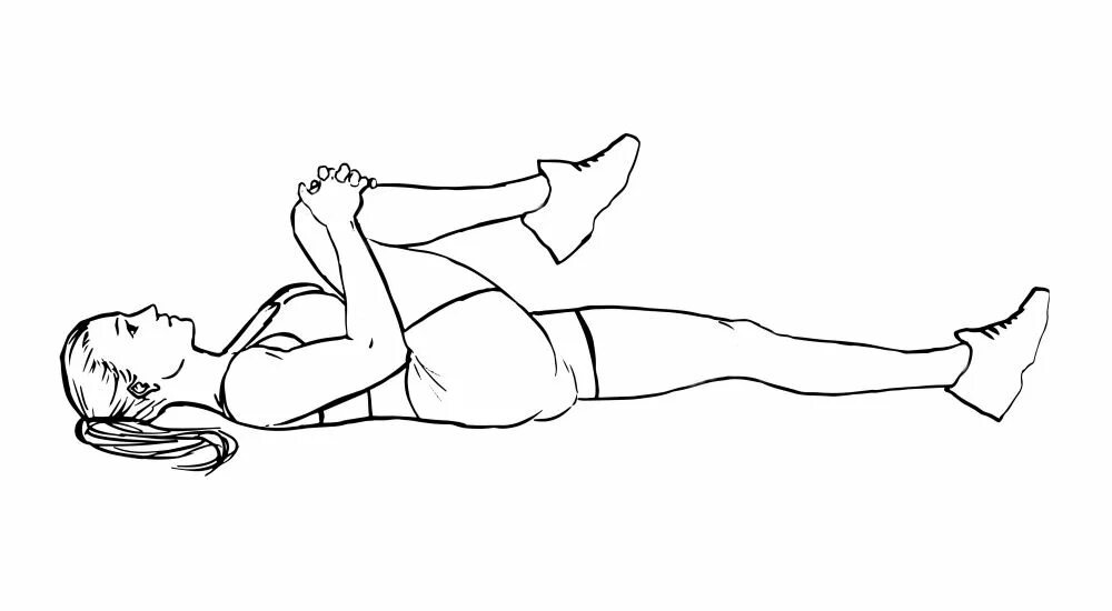 Лягте на ровную поверхность — не на мягкую кровать, лучше на коврик на полу. Согните ноги в коленях, стопы стоят на полу. Медленно подтяните одно колено к груди, помогая руками — обхватите голень или бедро. Подержите 5–10 секунд. Опустите. То же самое с другой ногой. Затем — оба колена вместе.