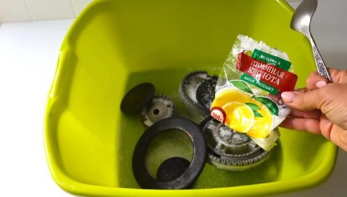 Для профилактической мойки или если загрязнения не сильные, я разбираю конфорки, помещаю их в таз и заливаю кипятком с 2 большими ложками лимонной кислоты.
