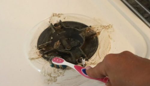 Такая паста с помощью губки или зубной щетки наносится на детали конфорки и оставляется на пару минут.