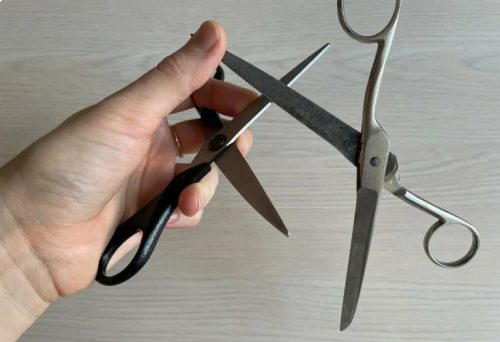 Первый вариант: тереть лезвие одних ножниц об лезвие других. Признаюсь, что данный способ не является моим фаворитом. Он отнимает много времени. Это мое личное мнение. Некоторым нравится затачивать ножницы именно так.