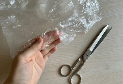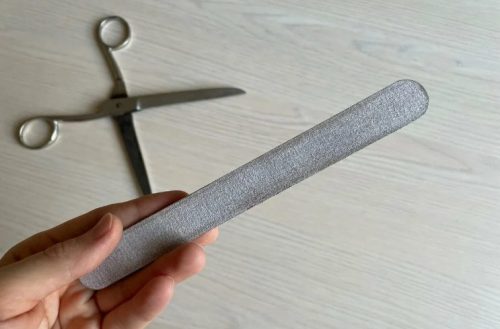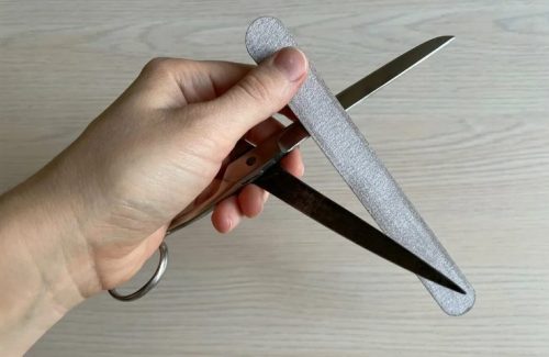 Второй вариант: использование пилки для ногтей. Я вожу пилочкой по поверхности лезвия. Потом ножницы становятся как новые. Чтобы проверить их остроту, я режу кулек из полиэтилена.