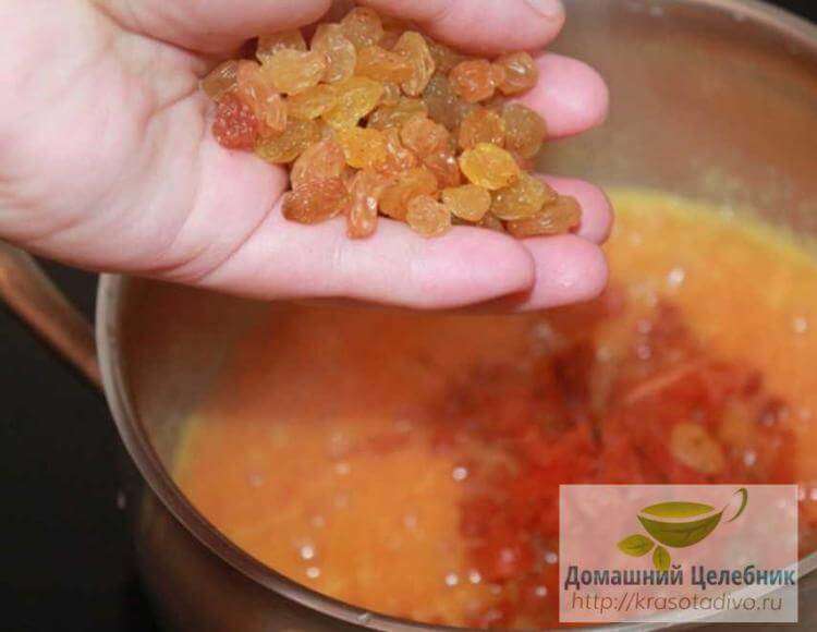 - Морковь почистить, нарезать кубиками, изюм промыть и все сложить в эмалированную кастрюлю, залить 1 л воды. Довести до кипения, но не кипятить, выключить.