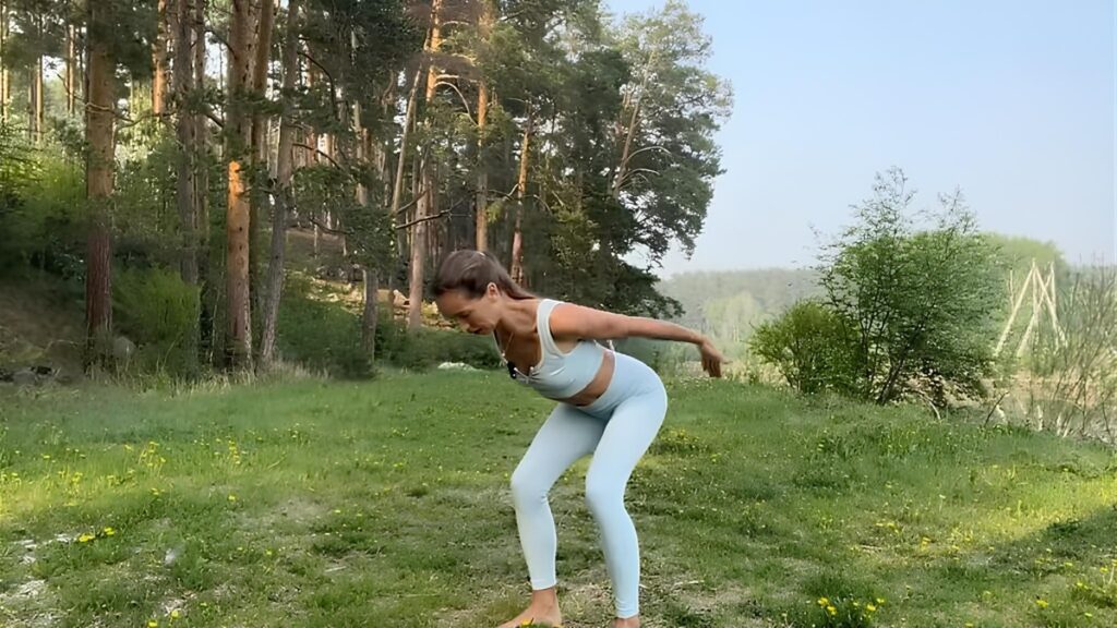 Опускаем руки и приседаем вниз, сгибаясь в области тазобедренных суставов