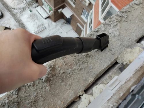 С помощью веника я убрал крошки цемента и вытряхнул их в щель. Также, я пропылесосил поверхность.