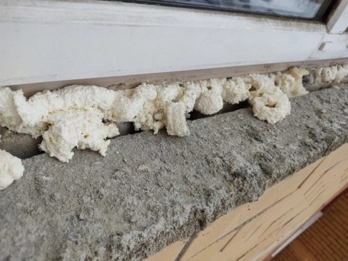 Теперь понятно, как в комнату проникал холодный воздух. Между внутренней и внешней стеной я увидел дыру не менее двух сантиметров. Наверное в этом отверстии должен был быть утеплитель, но его там не было. На самом отливе я увидел одинарную полосу пены. Она больше напоминала крепежную систему, чем утепляющий материал. Сейчас ее необходимо было убрать.