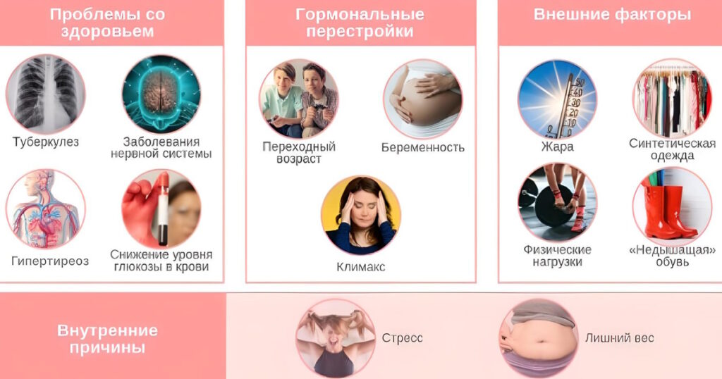 И вот проблема: если в условиях жары, духоты и во время тренировки потеть — это норма, то при минимальных нагрузках или в весьма прохладном помещении — нет.