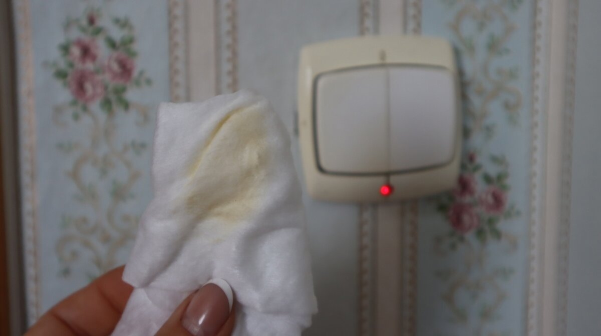 Надо только подкладывать бумагу вокруг выключателя, чтобы не намочить обои. Но даже, если средство попадает на обои, после высыхания не остается и следа.