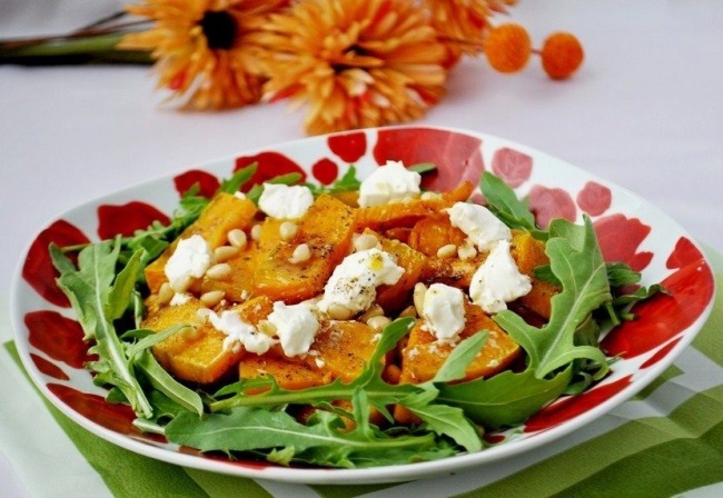 Запеките тыкву в духовке или на гриле до мягкости. Нарежьте ее кубиками. В миску выложите овощ, нарезанную руколу, творожный сыр и измельченные в блендере грецкие орехи. Приготовьте заправку из лимонного сока, мёда и соевого соуса. Добавьте к подготовленным ингредиентам и перемешайте. Можно вместо заправки добавить оливковое масло.