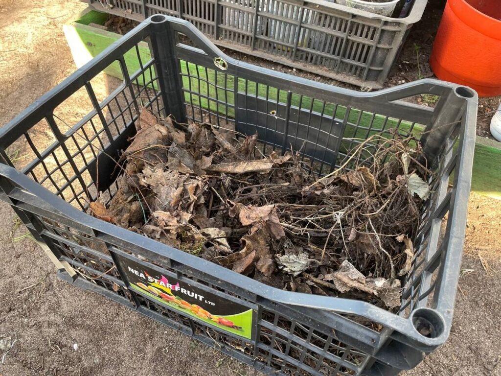 3) органика (мульча). Ее берем на грядках, под кустами, которые мульчировали в прошлом году. Можно нарвать зеленой травы или взять не перепревшую до конца органику из компостной кучи, прошлогодние листья.