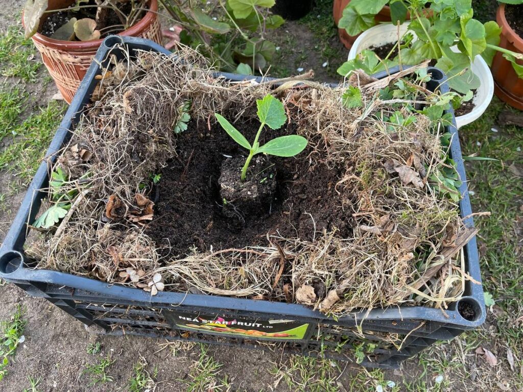 👉 После высадки корни кабачка быстро прорастут сквозь отверстия в ящике и станут осваивать новое питание. Уход за таким кабачком ничем не отличается от тех, что посажены обычным способом.