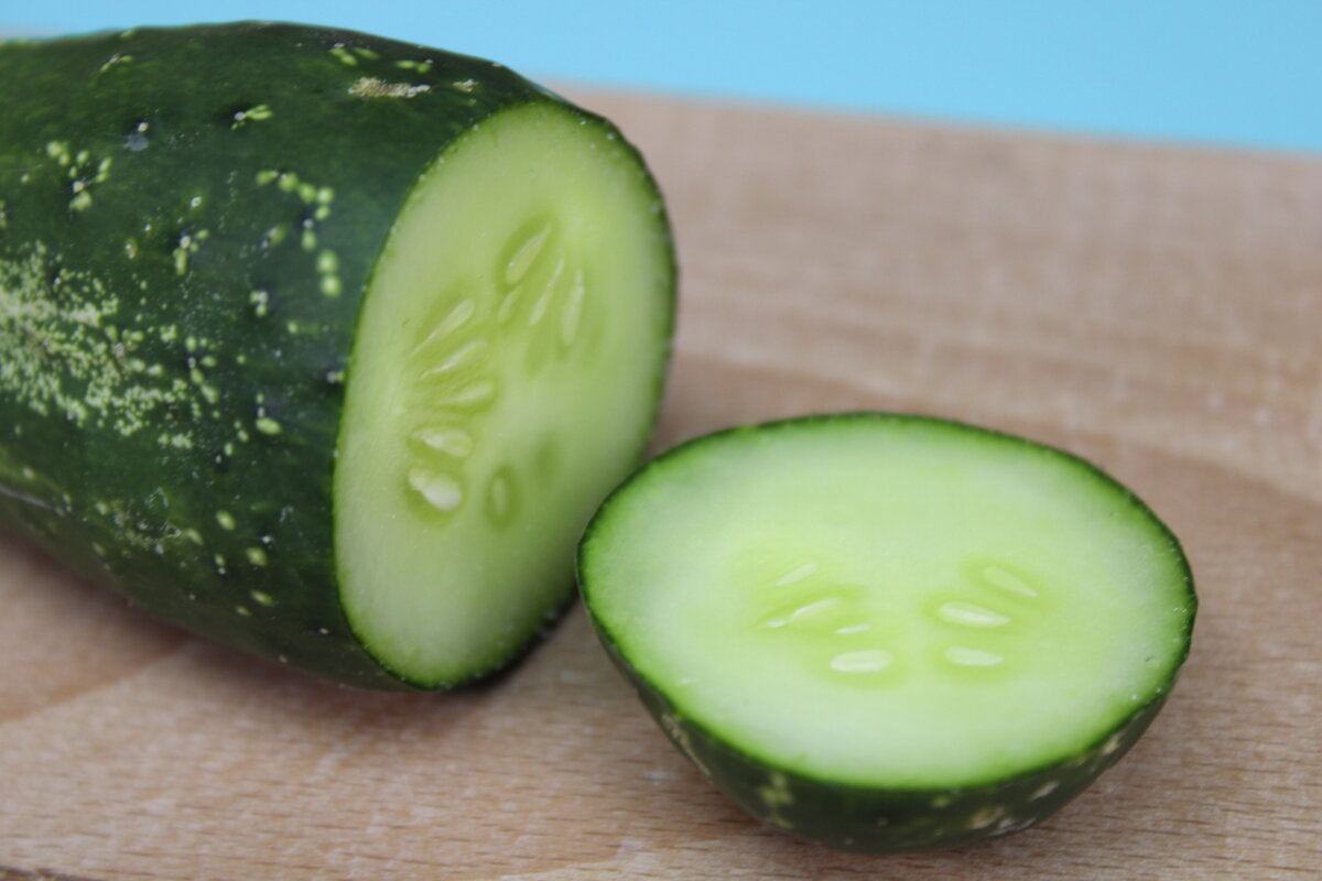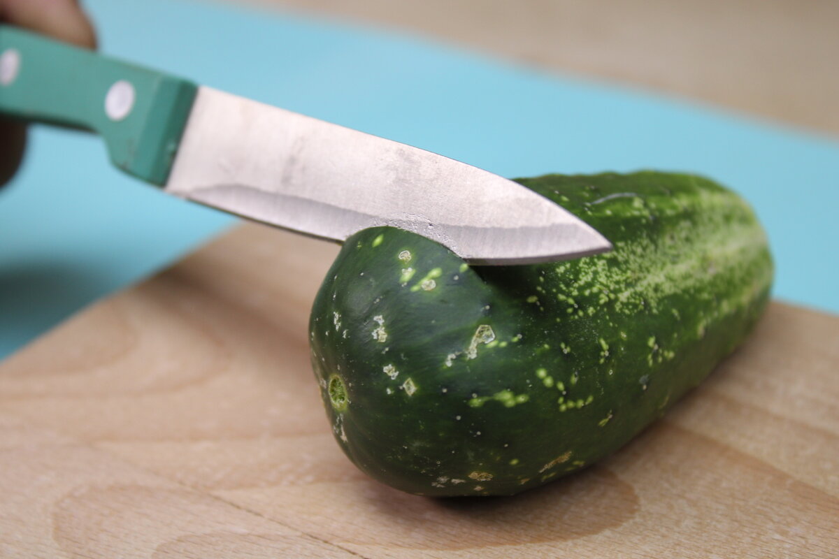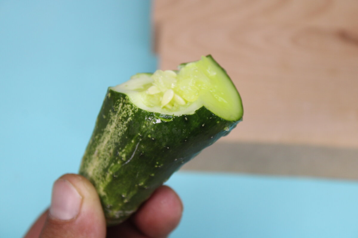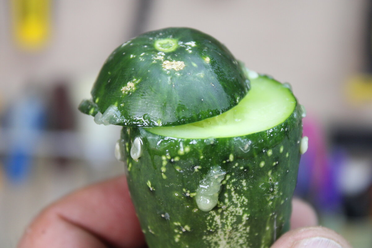 Теперь, натираем огурец отрезанной частью, буквально несколько секунд.