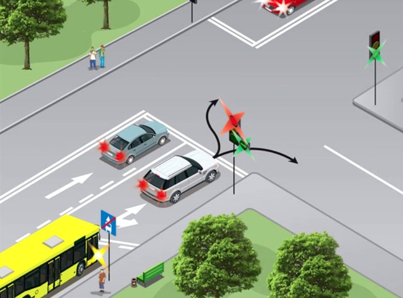 Он может спокойно дождаться зелёного сигнала светофора, либо, если сдали нервы, повернуть направо. Выезжать же на перекрёсток запрещено, и за это можно получить штраф!
