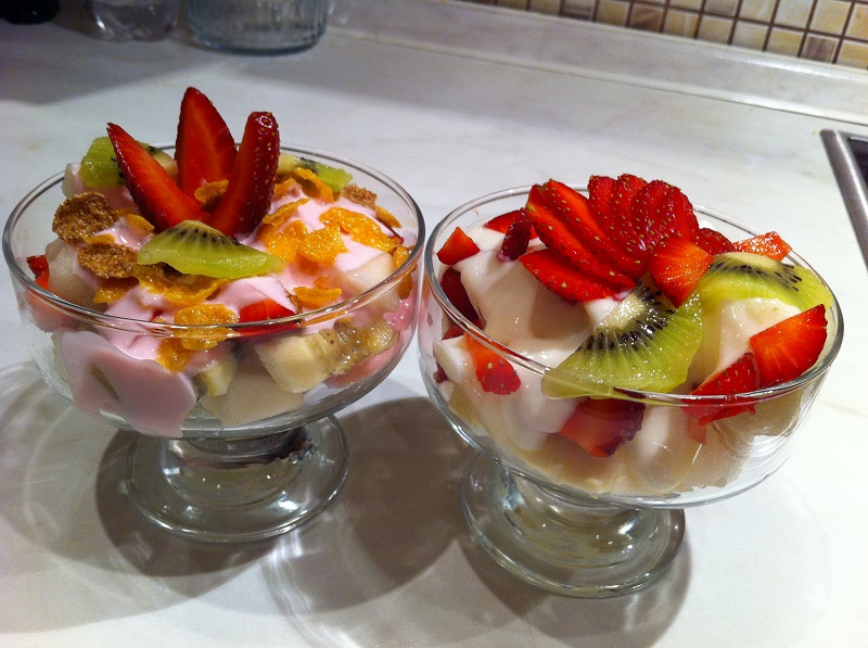 - Выложите хлопья на дно вазочки для салата, полейте небольшим количеством сливок, сверху выложите клубнику и остальные фрукты, заправьте сливками и отправьте в холодильник на три часа.