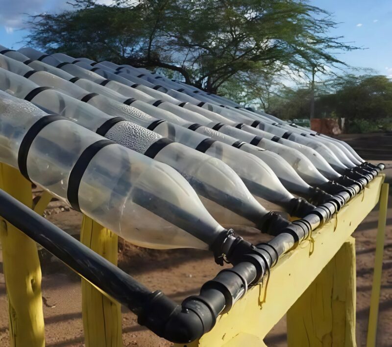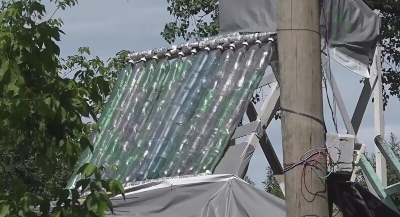 Оказалось, что это самодельная солнечная панель для нагрева воды. Мой друг объяснил, что вода, проходя через бутылки, нагревается под солнечными лучами и поступает в дом уже теплой.