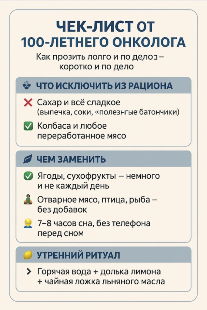 «Если человек в 100 лет не только помнит, где его очки, но и продолжает лечить других — к его словам стоит прислушаться. Особенно если онколог советует, от каких двух продуктов лучше держаться подальше, если не хочешь стареть, болеть и бояться за каждую родинку на теле.»