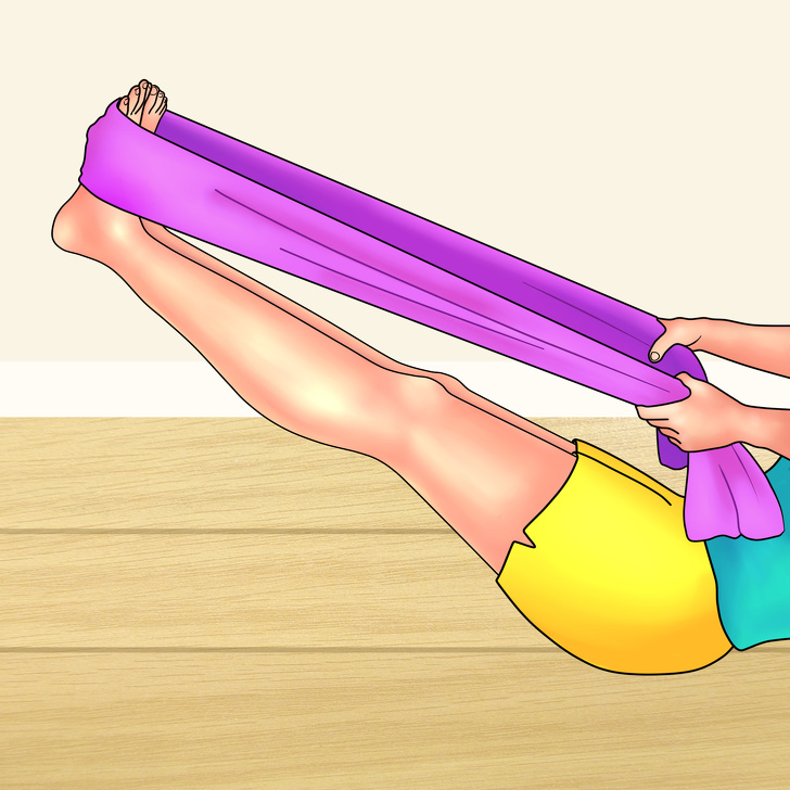 - Накиньте ремень или кусок ткани на одну ногу, поднимите ее, натяните ремень и удерживайтесь в таком положении в течение 30 секунд.