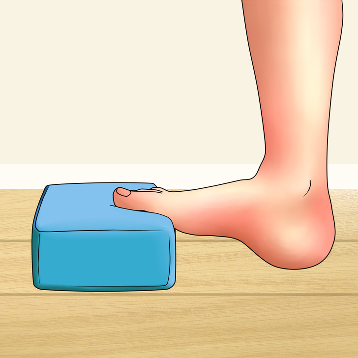 - Положите пальцы одной из ног на возвышение – например, блок для йоги, чтобы пятка касалась пола.