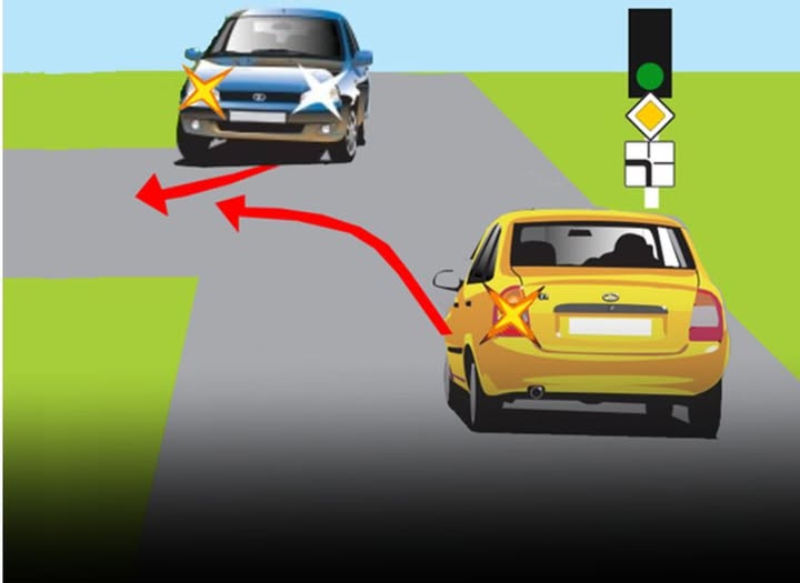 Две машины приближаются к регулируемому перекрестку на встречу друг другу. Желтый автомобиль собирается повернуть в левую сторону, а синий в правую. Возникает простой вопрос — а кто кому должен уступить, а у кого преимущество?