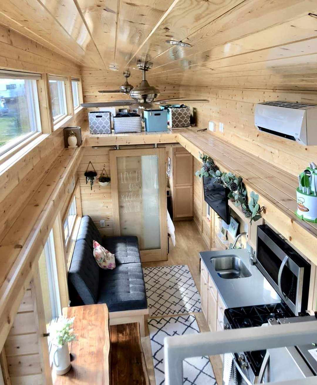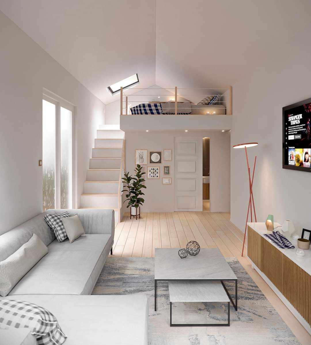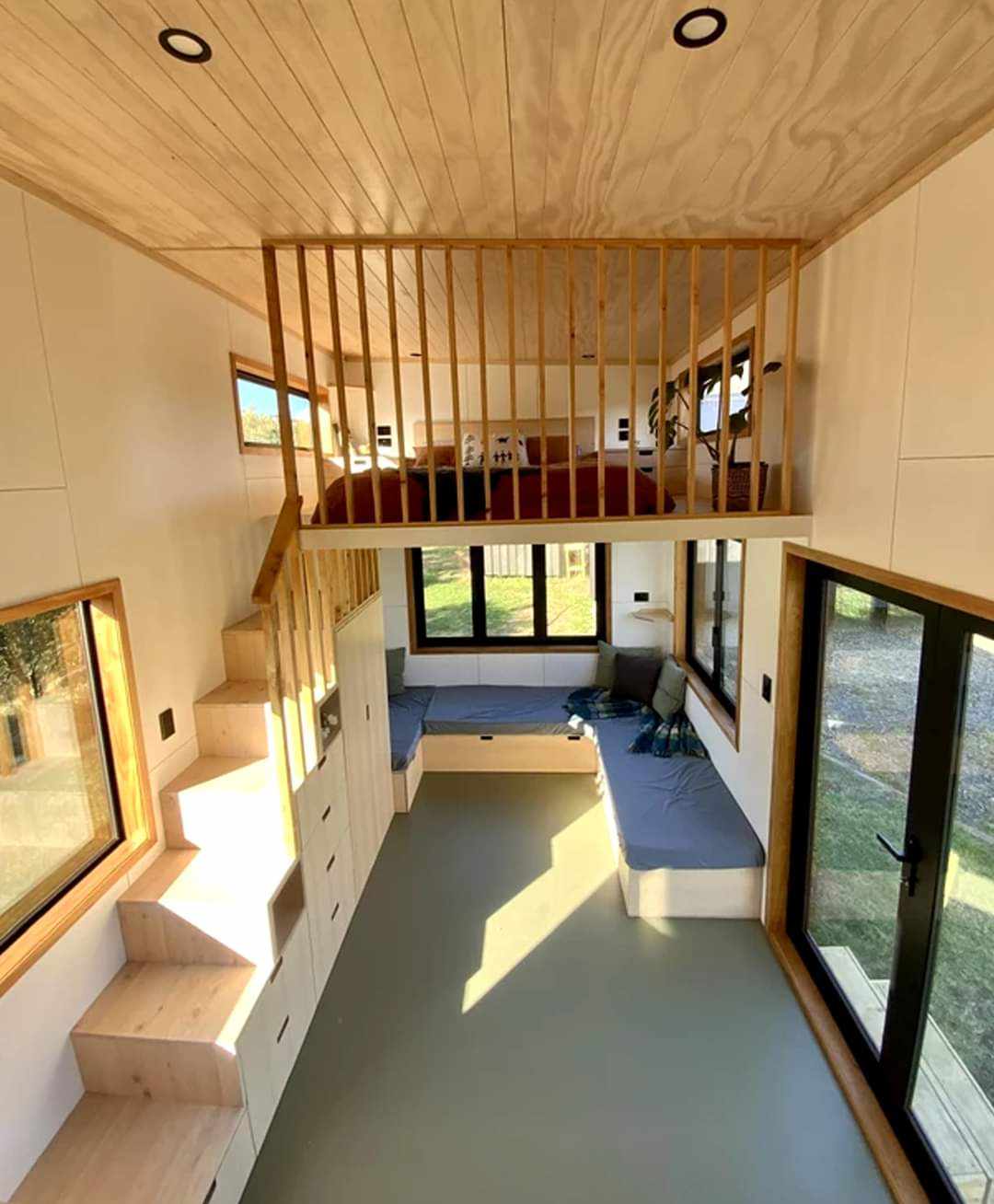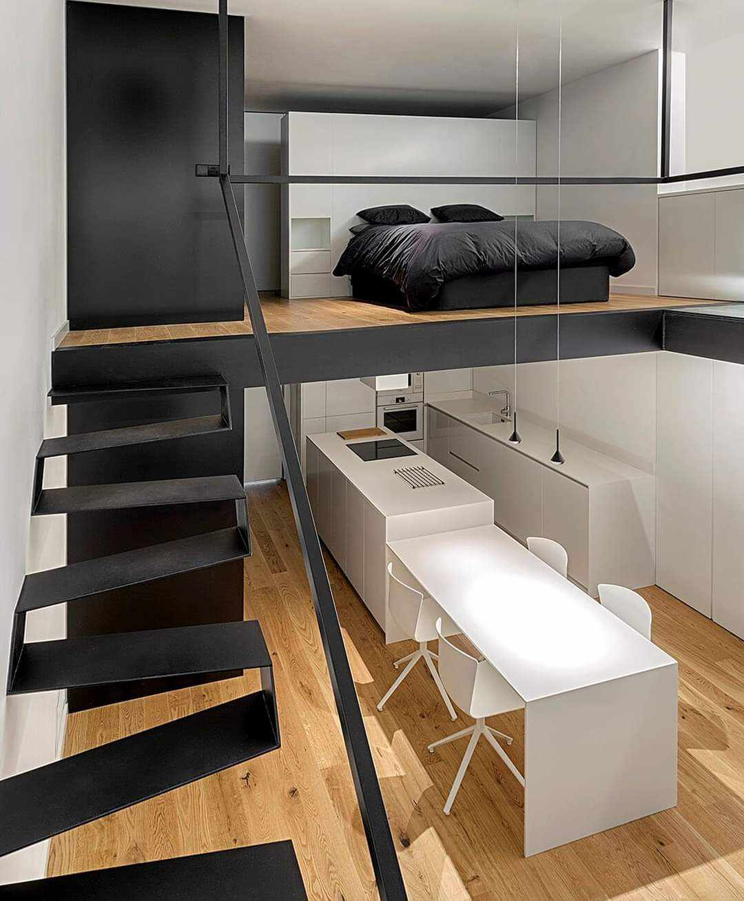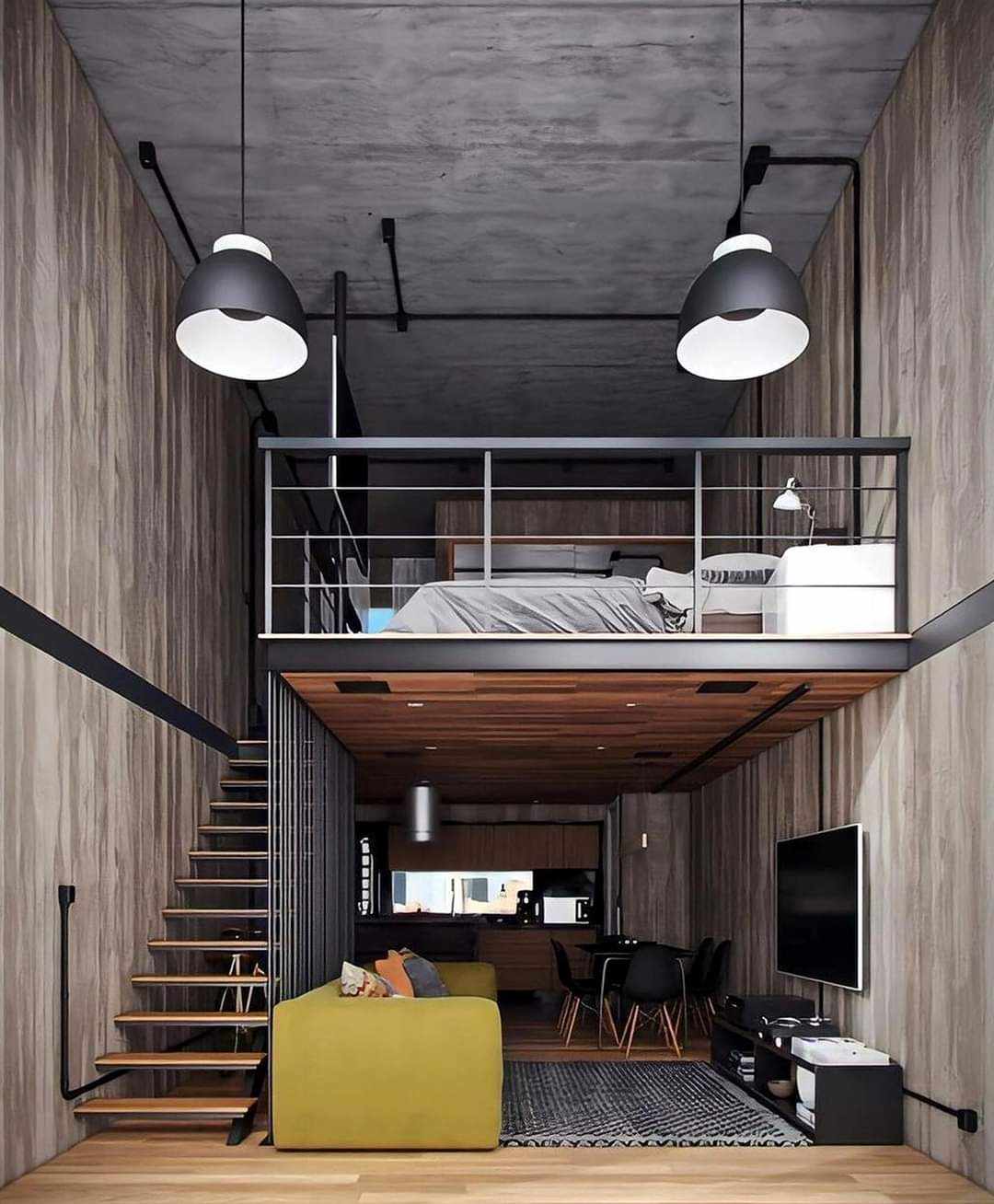 Спальное место на втором уровне. Если оборудовать кровать на втором этаже, это освободит первый уровень для обустройства гостиной, кухни или рабочей зоны.