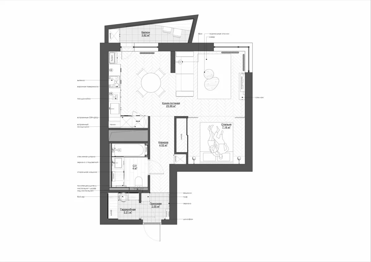 Однокомнатную квартиру превратили в студию. В результате перепланировки кухню объединили с комнатой и создали спальню в нише. Санузел удалось увеличить за счёт коридора.