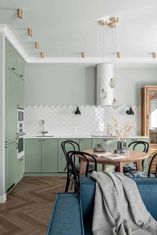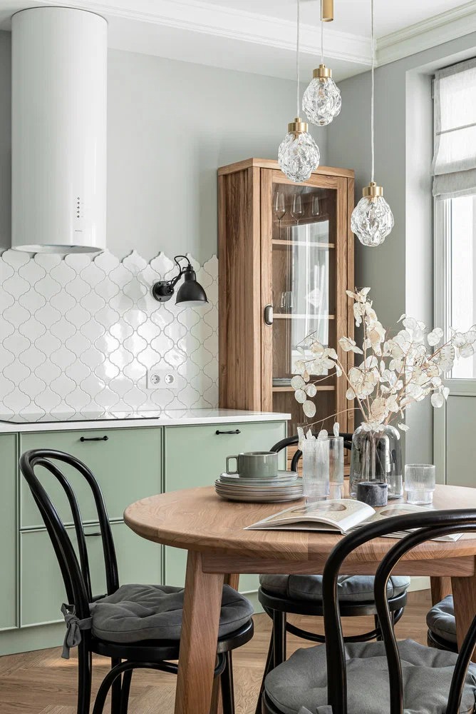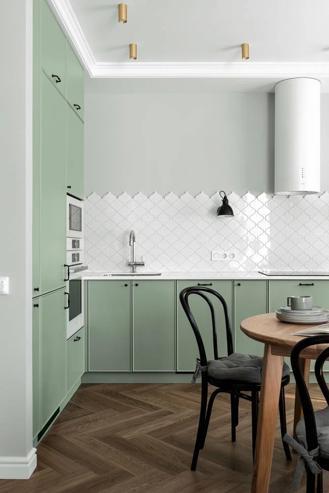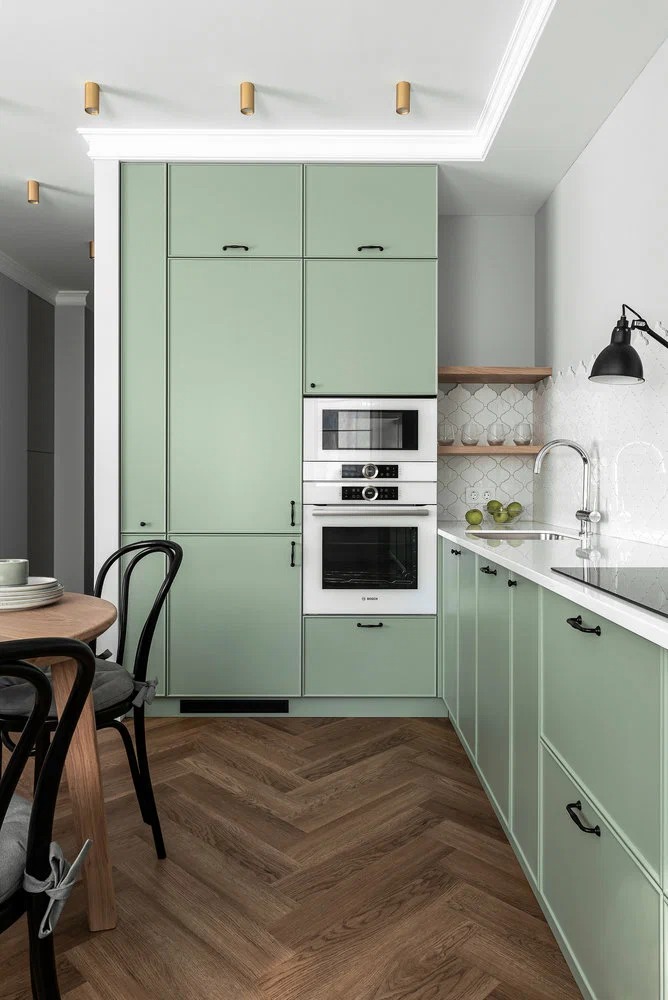Гарнитур построили Г-образно. Основную линию освободили от навесных шкафов. Пару антресолей предусмотрели только над пеналами с техникой, в углу за ними находится скрытая ниша с полками. Чтобы найти нужный оттенок зелёного для фасадов, пришлось делать порядка шести выкрасов.