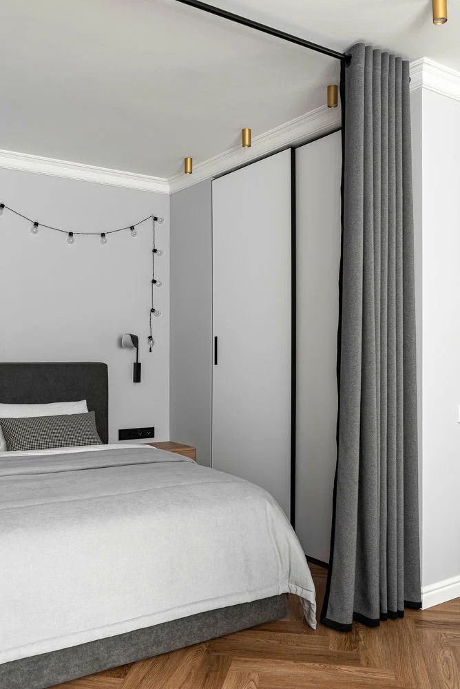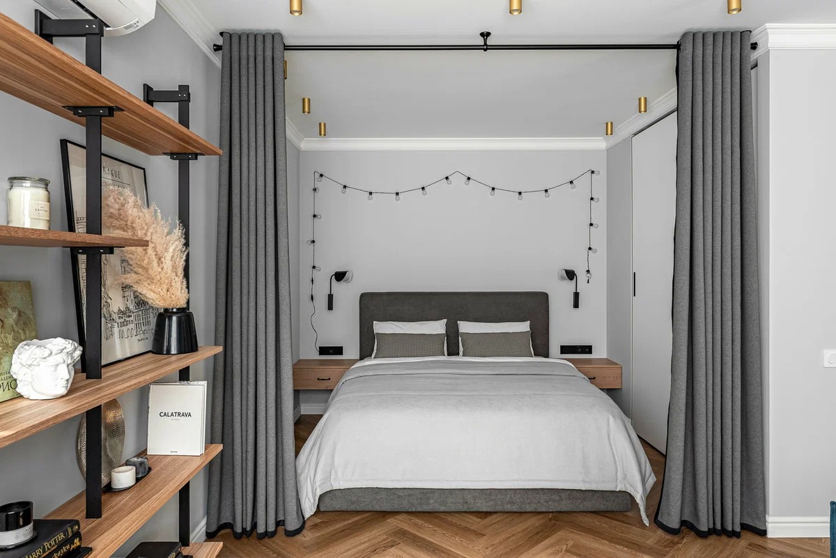Спальню от общего пространства отделили плотными шторами. Внутри запланировали нишу для шкафа-купе. Он служит дополнением к гардеробной в прихожей.