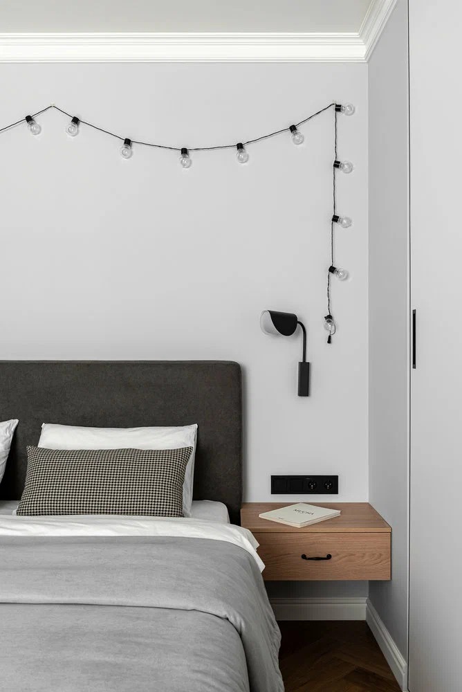 Помимо бра и потолочных спотов над изголовьем повесили гирлянду, которая создает более уютную атмосферу.