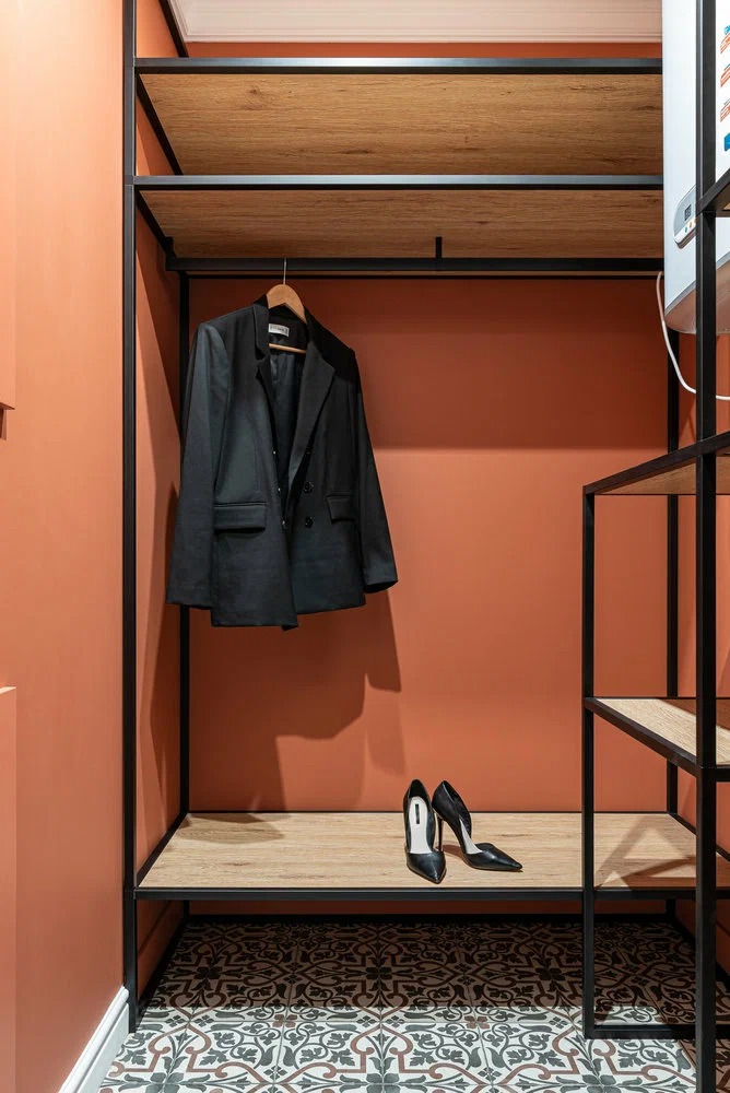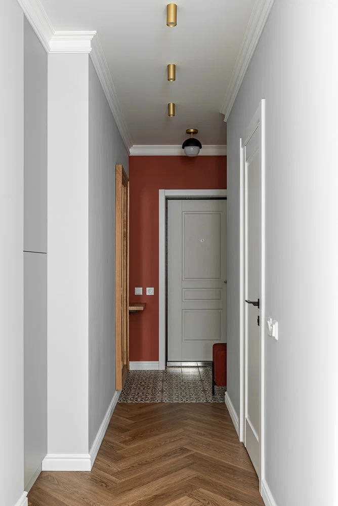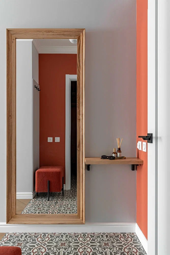 Прихожая стала, пожалуй, самым ярким помещением в квартире — для покраски двух смежных стен использовали акцентный терракотовый оттенок, а на пол уложили плитку с орнаментом. Основное хранение организовали в гардеробной, а при входе обошлись минимальным набором мебели — повесили зеркало, полку для мелочей, панель с вешалками и поставили пуф.