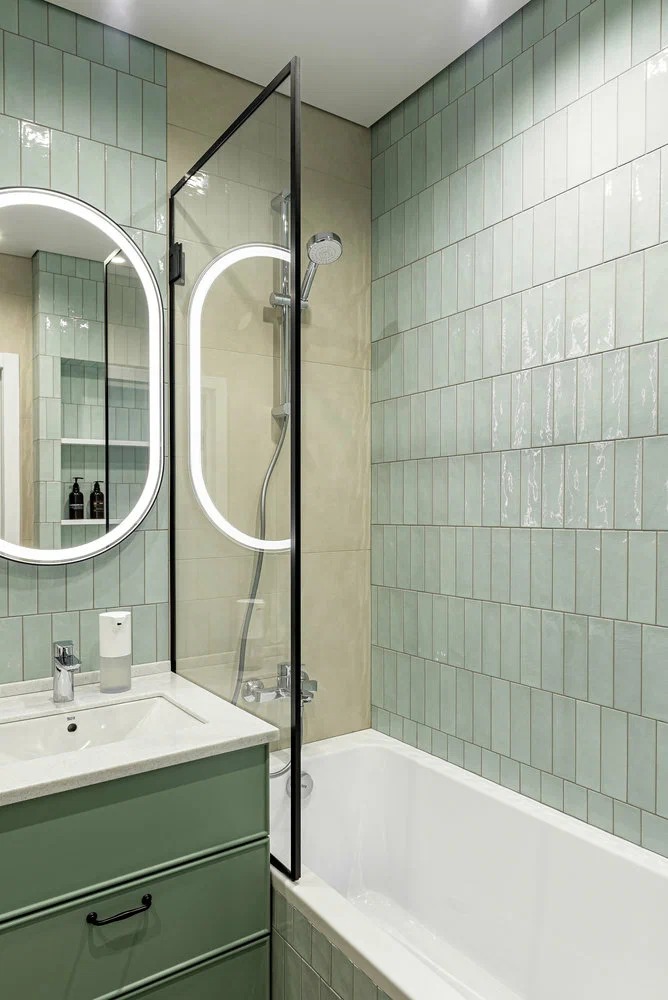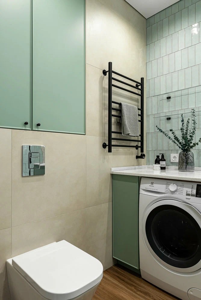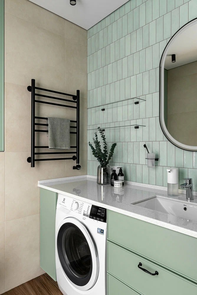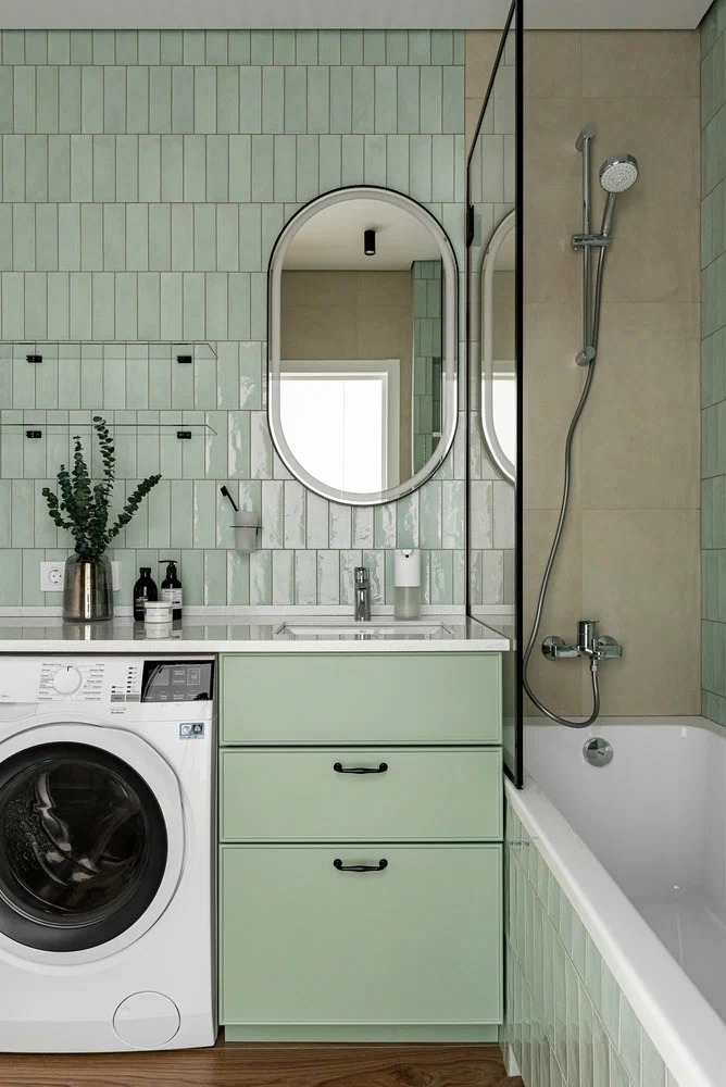 В отделке санузла скомбинировали несколько видов керамики. Нежно-зелёную плитку подбирали под цвет фасадов мебели — они такие же, как и в кухне.