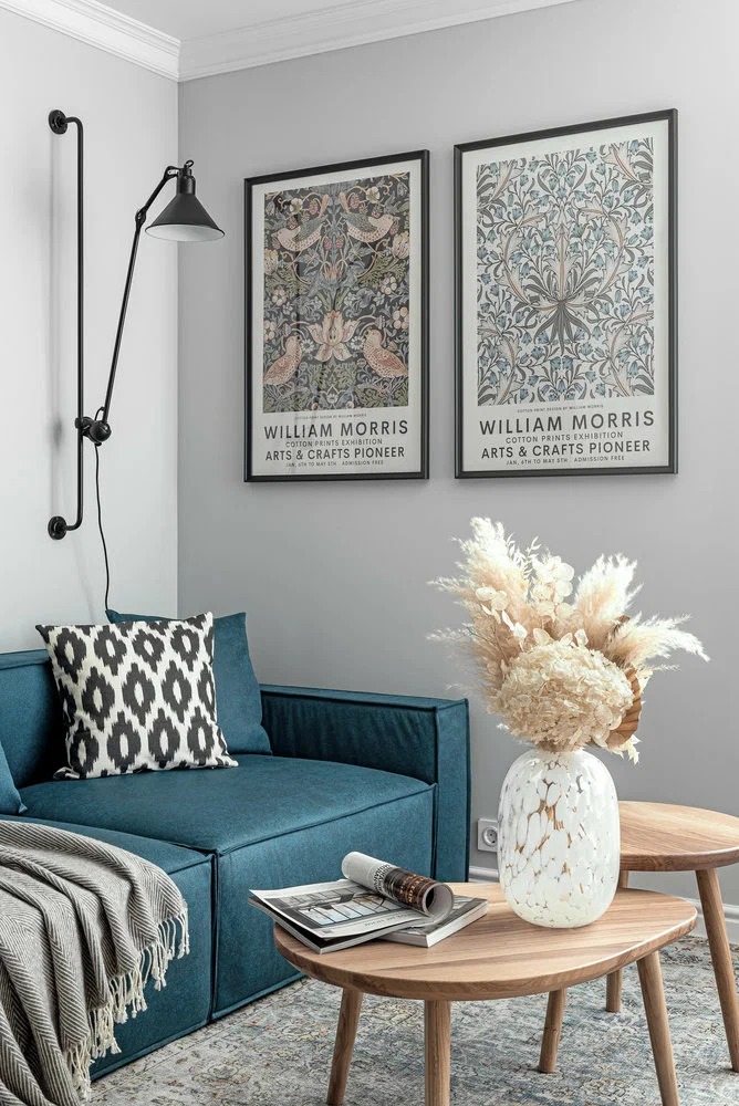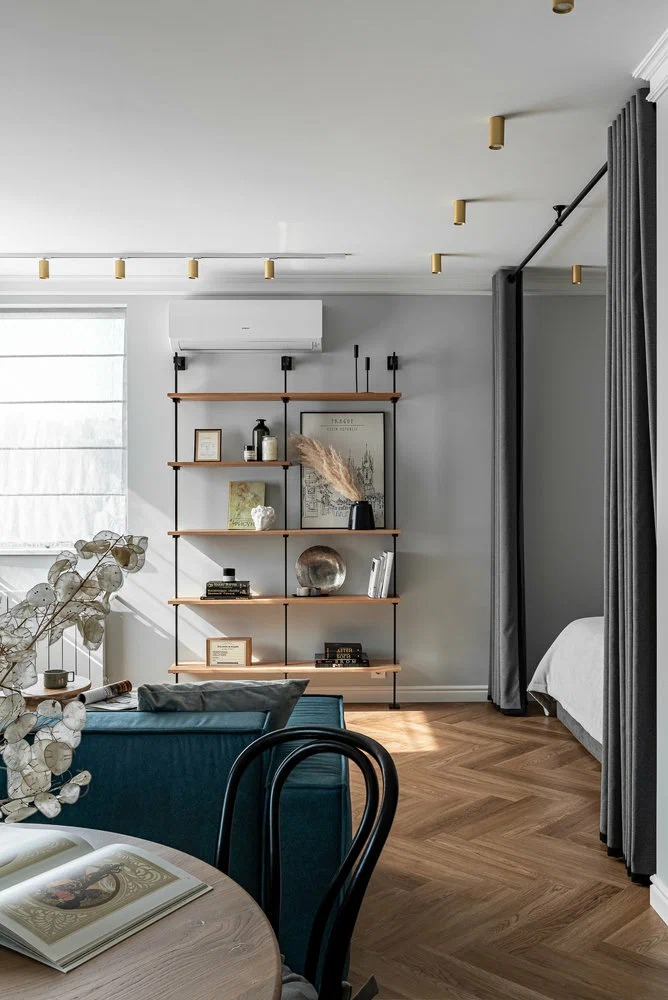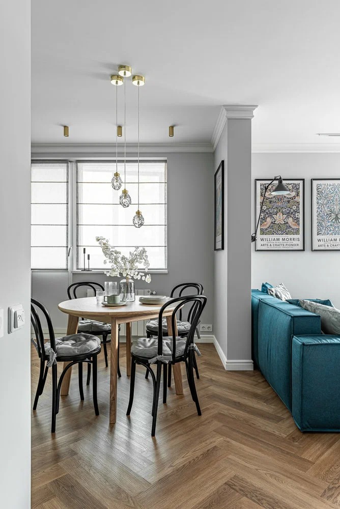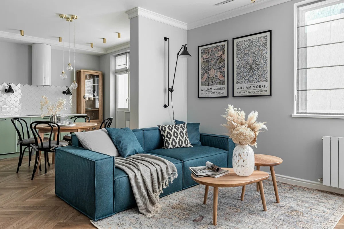 Чтобы зонировать гостиную и кухню, сохранили фрагмент перегородки от застройщика. Сразу за ней поставили диван в акцентной синей обивке. Он выделяется на фоне нейтральных свело-серых стен.