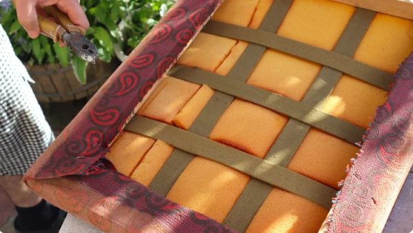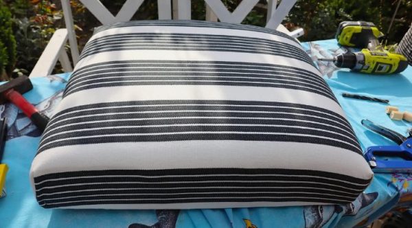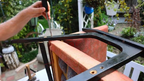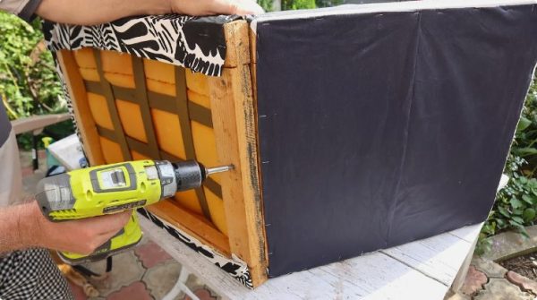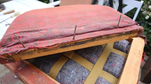Новая обивка у меня стала практически такой же, какой была старая, ее крепила к планкам, сосна не мягкая, а прочная порода, вероятно, даже клен. Все, что остается сделать – сложить все заново. Для крепления сиденья я задействовала длинные шурупы вместо гвоздей.