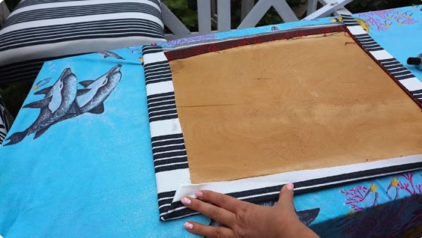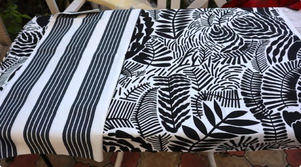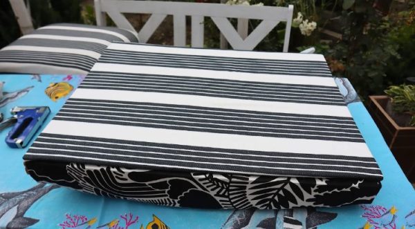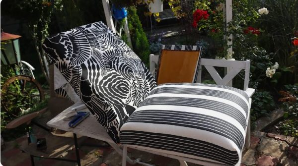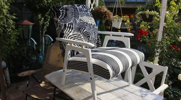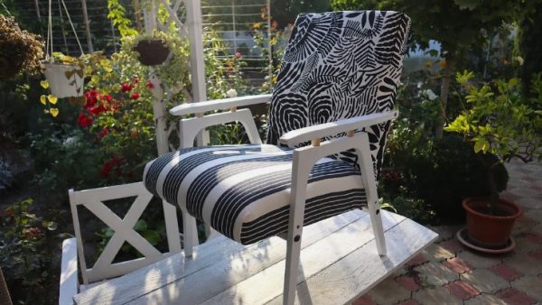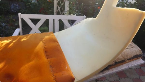 Чтобы решить поставленную задачку, мы просто использовали новый поролон, толщина которого составила 4 см, и закрепили его. Для кресла была куплена обшивка разных цветов по 80 см. Подлокотники к тому времени уже были в черной краске, местами имели потеки, но их я зашкурила, что привело к полноценному изменению цвета.
