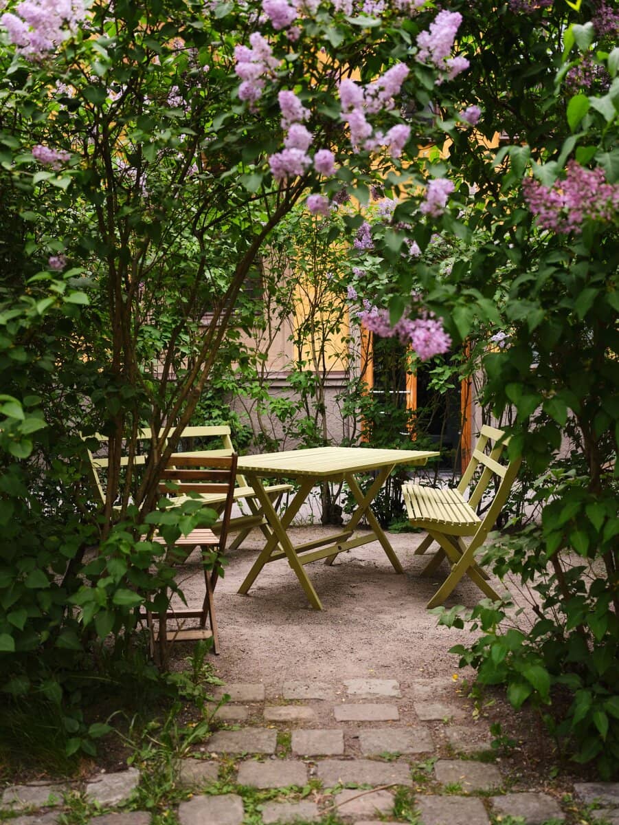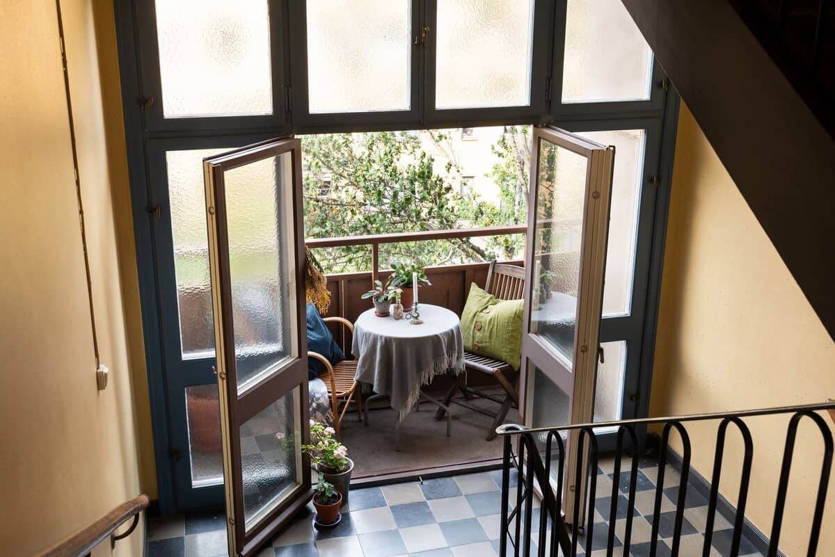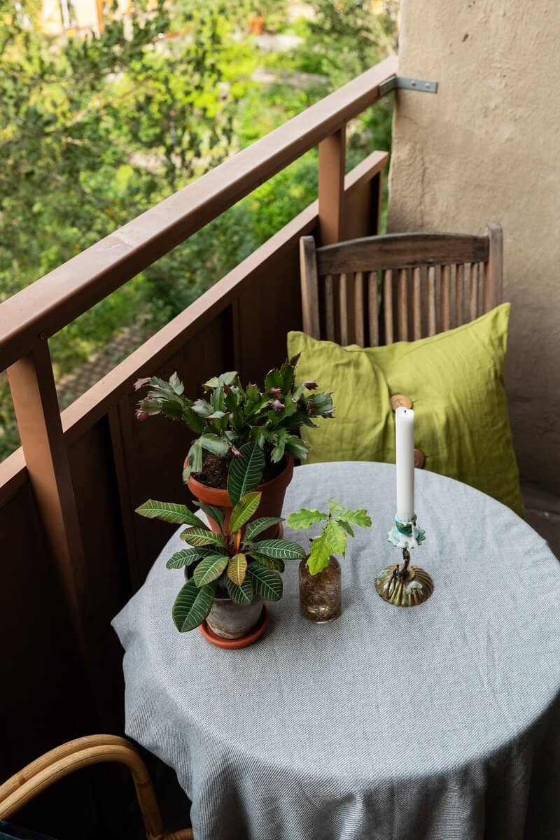 Соседи обустроили его (и другой, этажом ниже) своими силами. Кто-то принес цветочный горшок из дома, кто-то поделился пледом, кто-то привез из сада сухоцветы, а на мебель (стол и стулья) скинулись вместе.