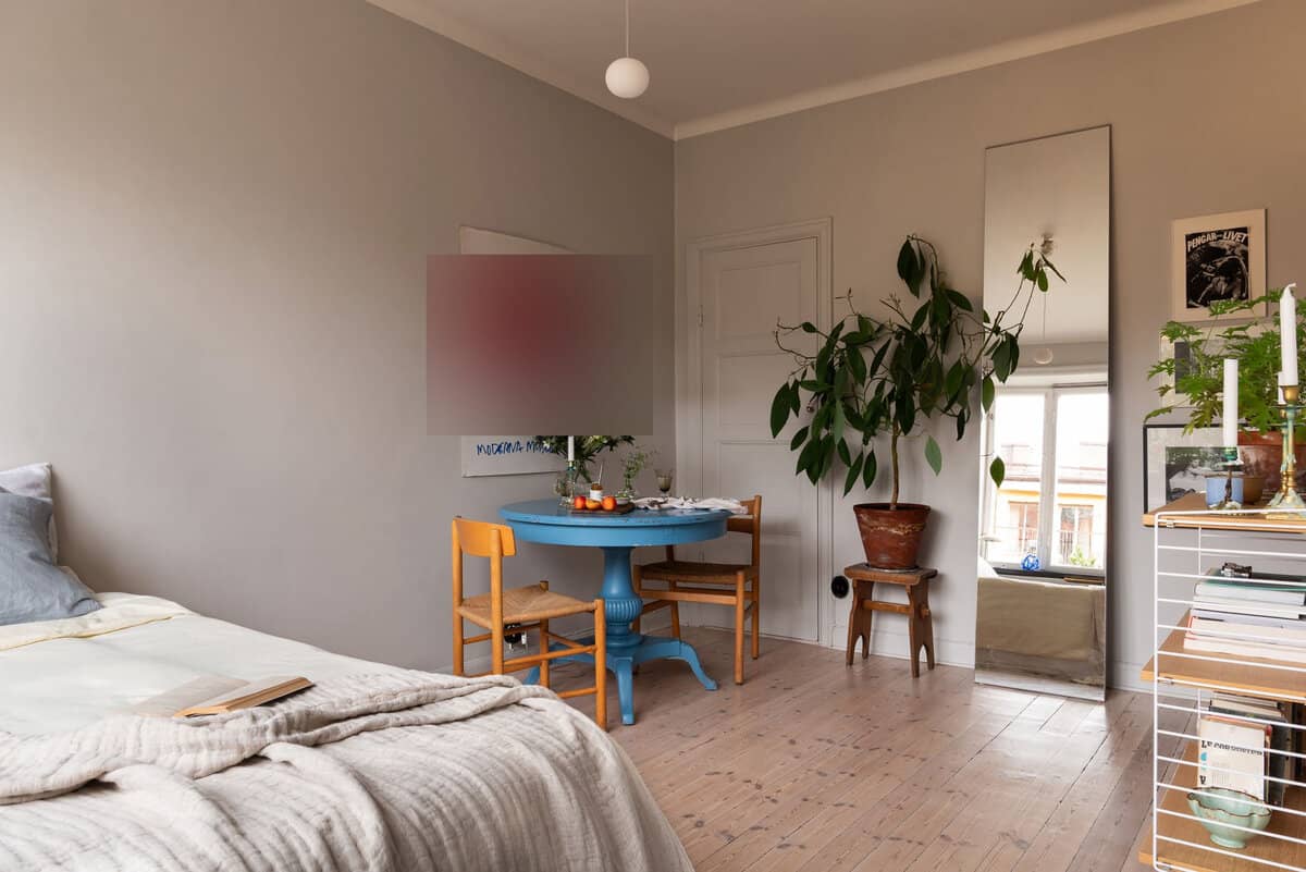 А вот так выглядит вторая половина единственной комнаты. Тут уже поярче! Стулья из светлого дерева, старенький голубой стол, акцентная картина (мне ее пришлось замазать из-за не очень приличного рисунка) и шикарный цветок на табуретке — эти предметы разбавляют скупой (в хорошем смысле слова) скандинавский стиль.