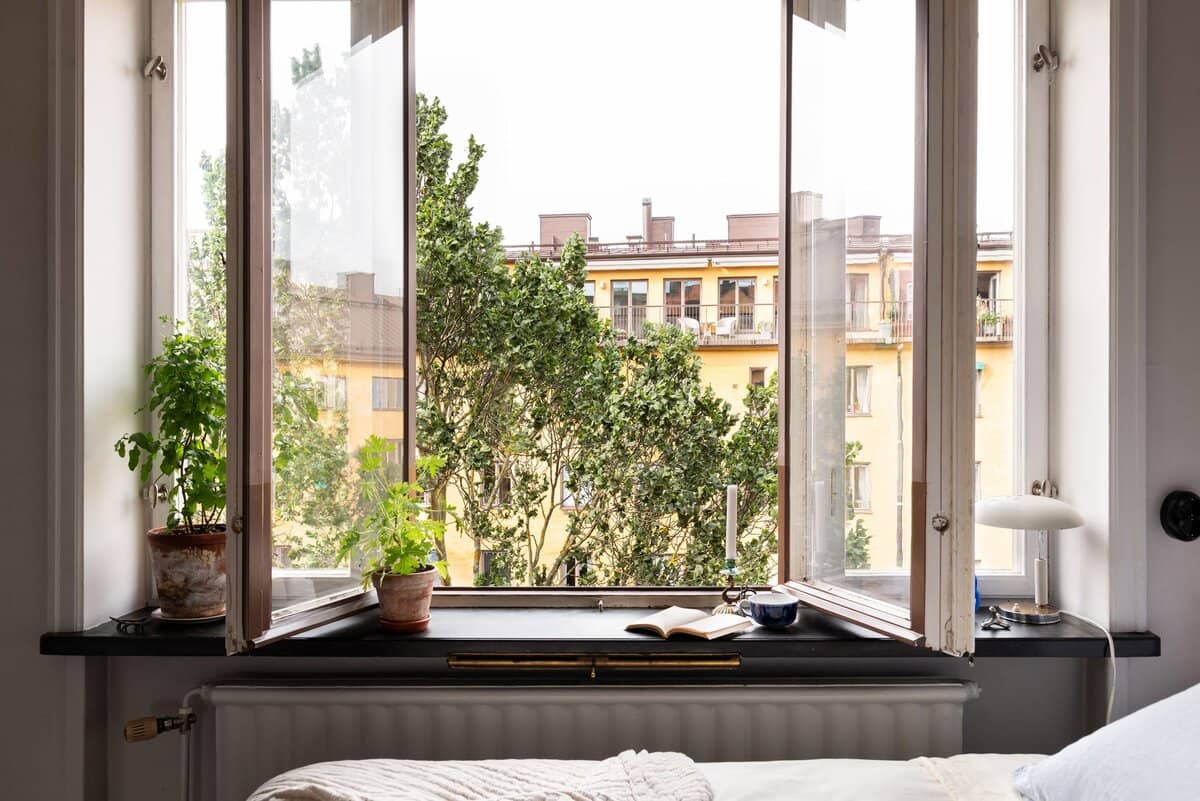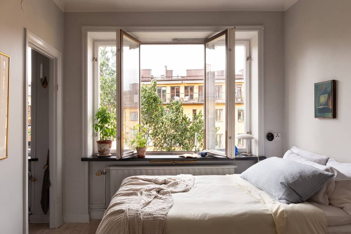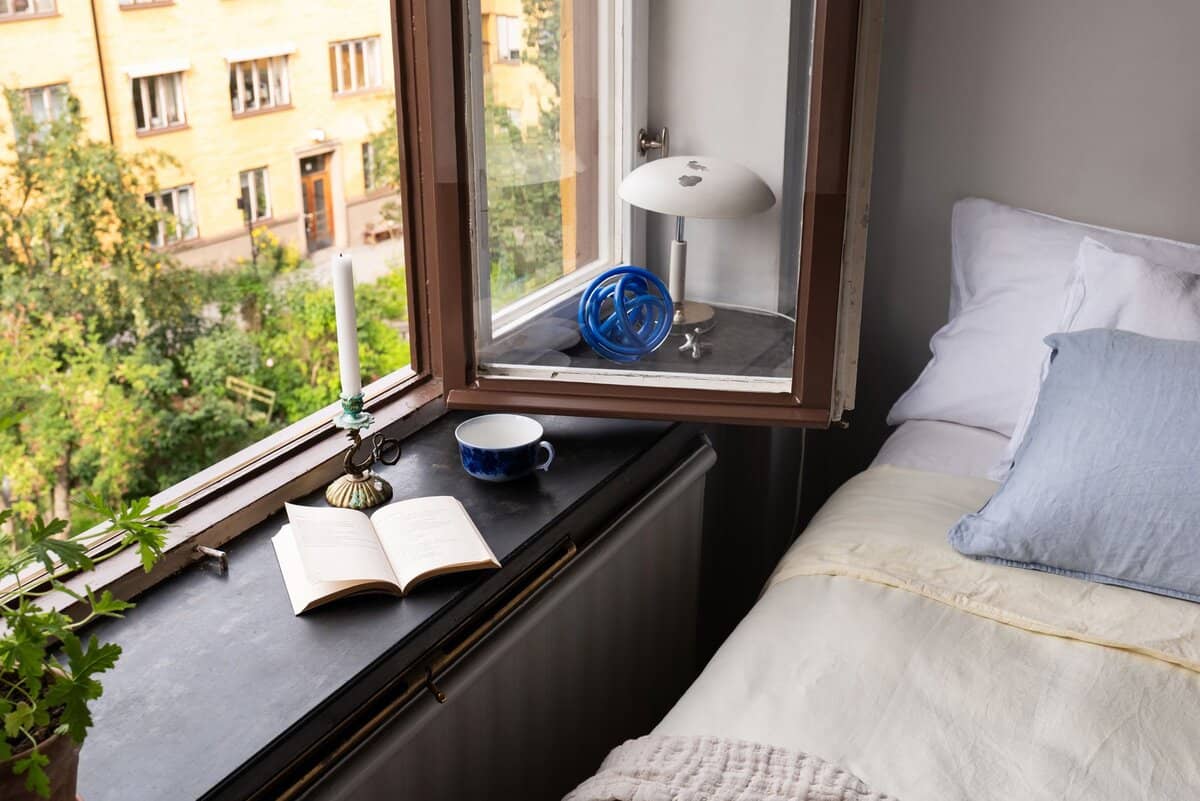 Подоконник в такой квартире — еще одна рабочая, полезная поверхность. При необходимости можно воспользоваться выдвижной полочкой (видите её?), туда хорошо ставить кружку с кофе, когда читаешь в кровати, или ноутбук.