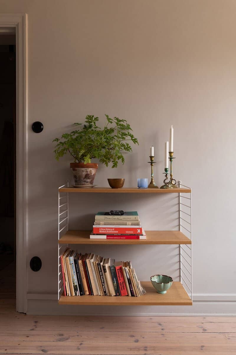 Небольшая полка с книжками и свечами хорошо сочетается с деревянным полом и не выглядит аномально в этом интерьере.