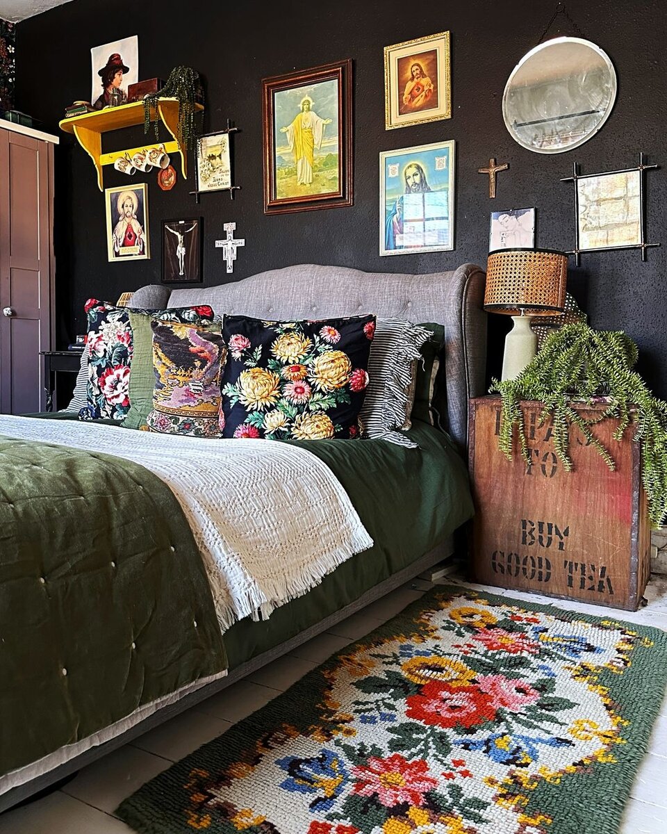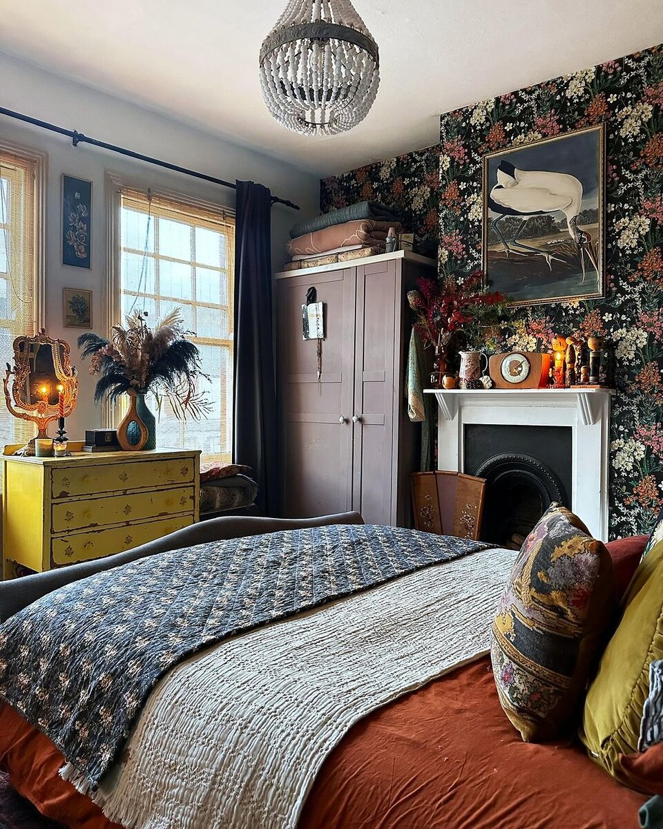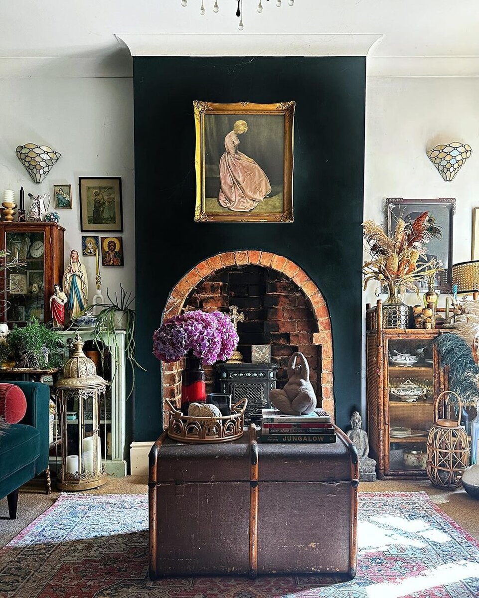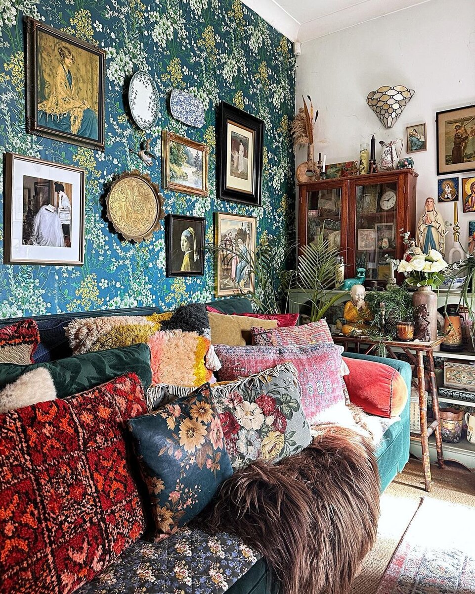 Фотографии этого дома публиковались во многих интерьерных журналах. И не удивительно — он резко выделяется на фоне однообразных скучных интерьеров. Каждый уголок пространства здесь занят какими-то винтажными вещами — повсюду висят картины, стоят статуэтки, лежат ковры. И всё это на фоне мрачных обоев и темных стен.