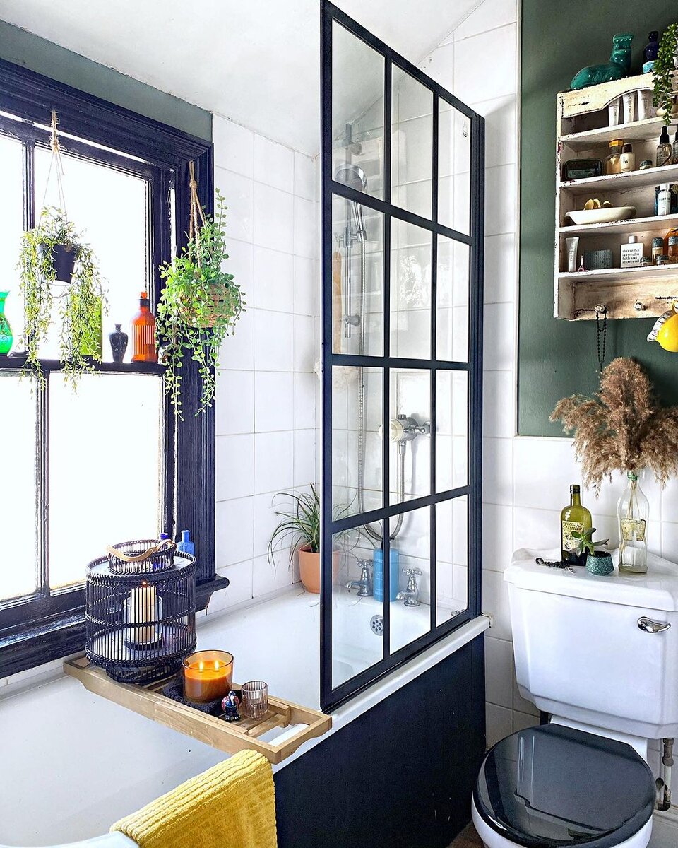 Ванная комната тут тоже особенная — с окном, откуда открывается обзор на закрытый задний дворик, и стеклянной перегородкой вместо шторки
