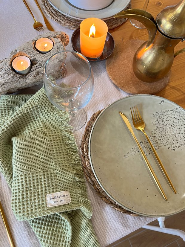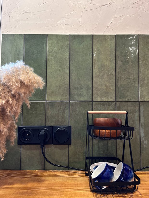 Кухонный фартук отделан плиткой, без которой мы не мыслили наш интерьер. Это та самая плитка из Pinterest испанского бренда в цвете «Terre Emerald». Она будто бы сделана вручную — это сразу наполняет пространство элементами, за которые цепляется глаз, они интересны и их хочется рассматривать. Поэтому интерьер изо дня в день не надоедает.