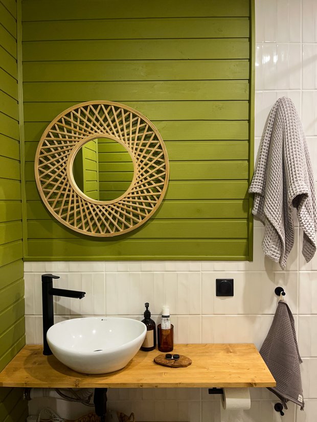 Из-за особенностей каркасного дома стены облицованы и плиткой, и вагонкой. Вагонку здесь мы покрывали специальной мебельной краской, чтобы защитить от большой влажности и воды.