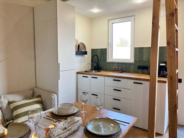 Нам была важна полноценная кухня. Почему-то бытует мнение, что если это мини-дом, то все должно быть мини, и кухня в том числе. Это не всегда верное решение: важно учитывать и сохранять эргономику пространства.