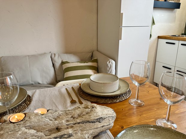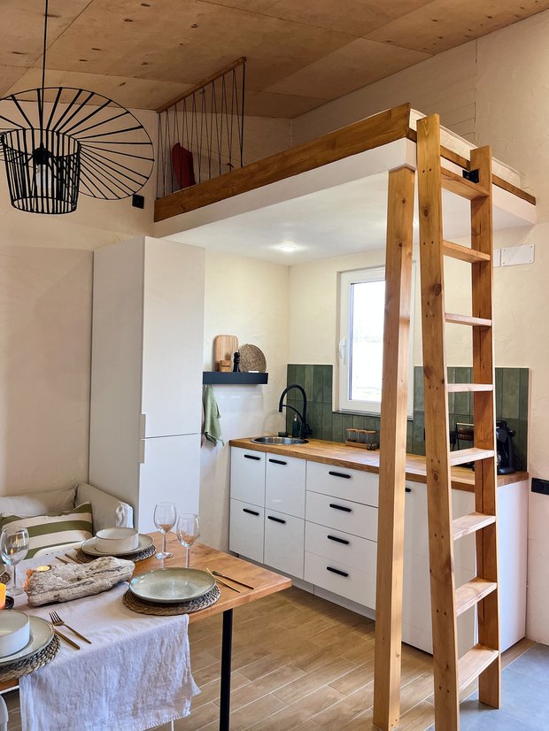 Мы вдохновлялись идеей Tiny House и интерьерами испанских вилл и в процессе адаптировали под себя. Хотелось создать наполненный цветом интерьер, который отражает эмоции и характер жизни в солнечной Анапе, подчеркнуть натуральные и природные материалы и красоту фактур.